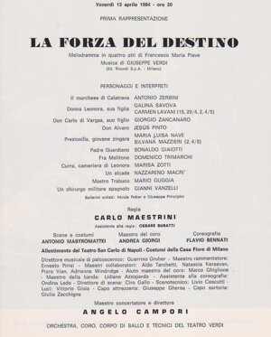 "La Forza del Destino a compimento stagione lirica Trieste nell'allestimento San Carlo di Napoli Con angelo Campori direttore, Carlo Maestrini regista, coadiutore Cesare Buratti, Due soprani alternatisi: Galina Savova e Carmen Lavani, poi Maria Luisa Nave "Preziosilla" e Marisa Zotti "Curra".
