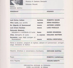 "La regia di Adriana Lecouvreur al Grande di Brescia, protagonista Maria Chiara, è stata realizzata da Maestrini con la collaborazione di Cesare Buratti che, subito dopo, al Donizetti di Bergamo ne è stato responsabile in prima persona.